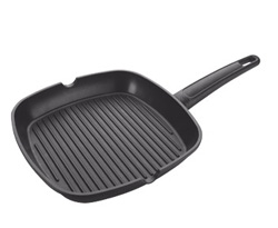 - массивная литая сковорода с покрытием для грилования, замечательна приготовления стейков, рыбы и т.д.